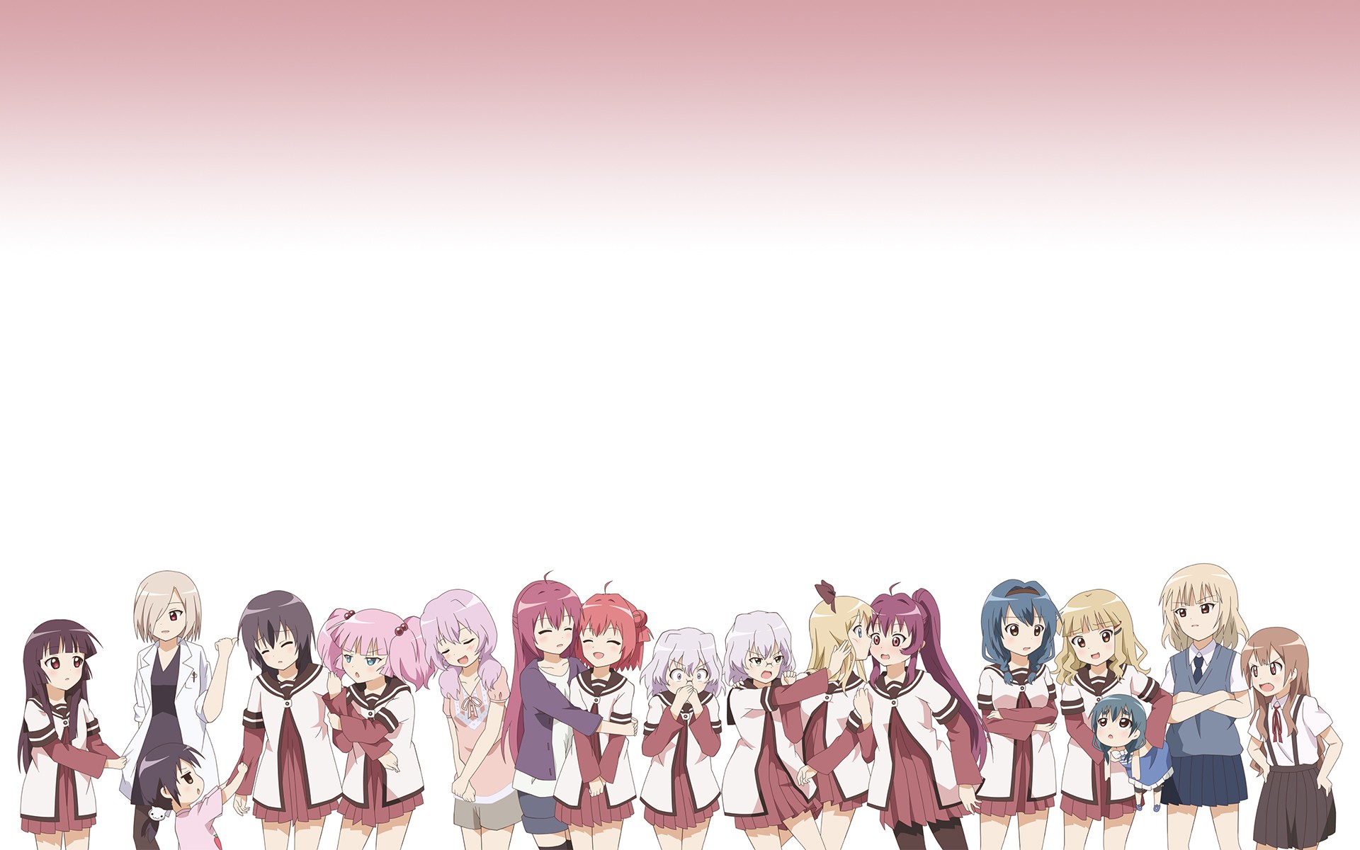 Description: A group of anime girls standing next to each other in front of a white background with a pink border.