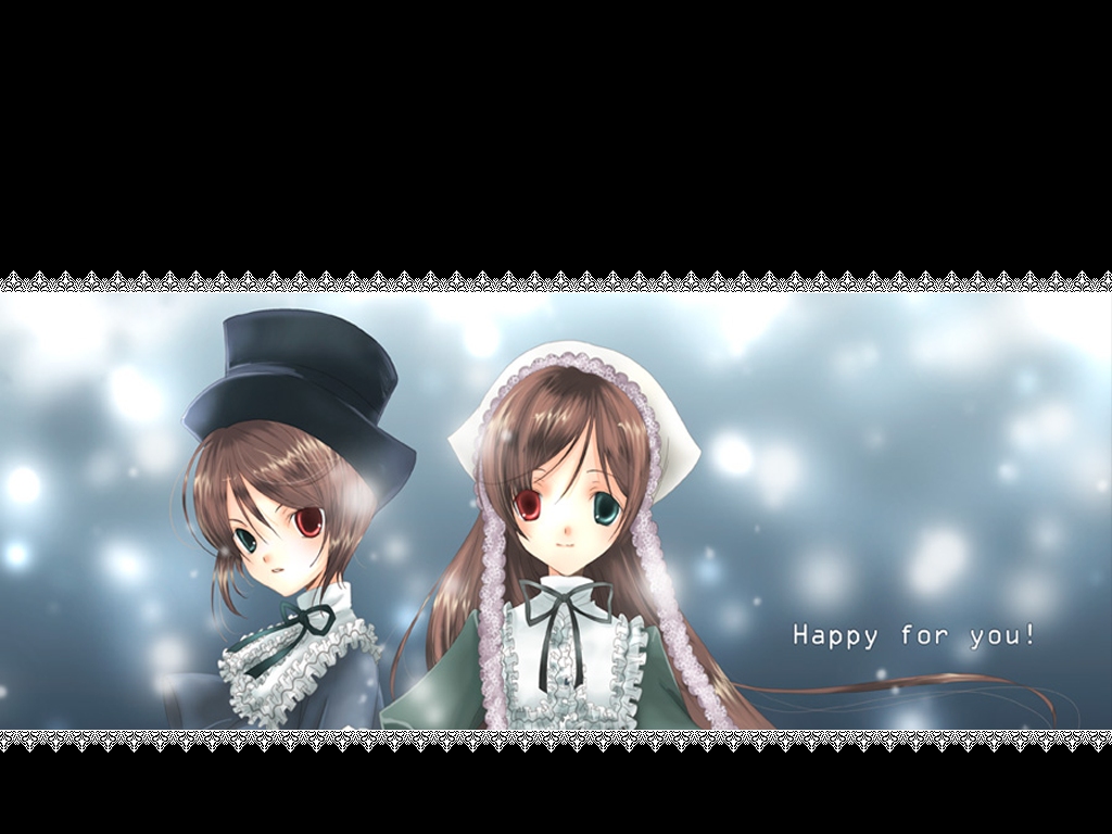 Description: Two anime girls wearing hats and dresses with a happy birthday message in the background of the picture.