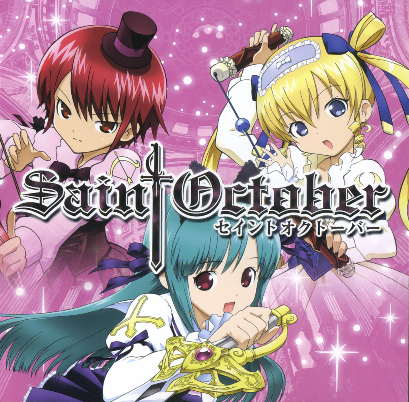 Description: A group of anime girls with hats and hair in front of a pink background with stars and stars in the background.