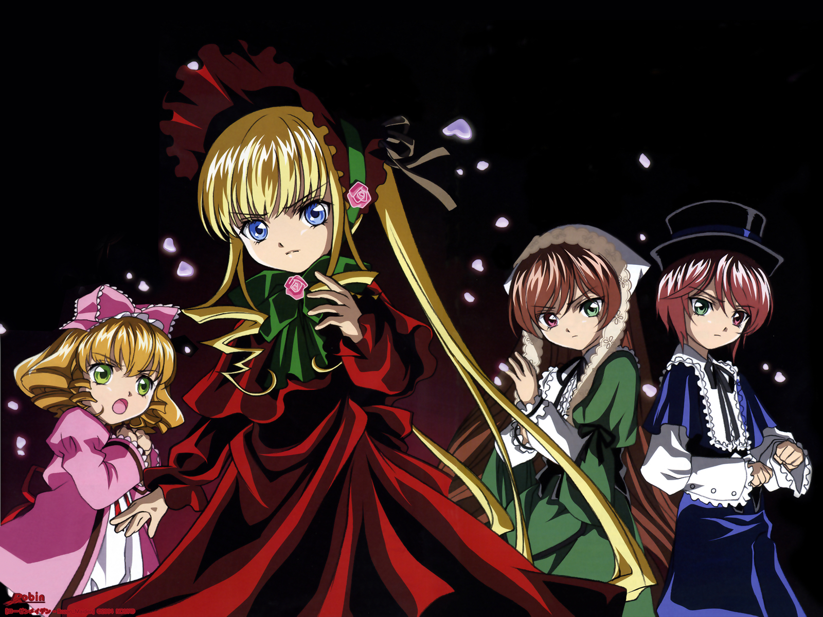 Description: A group of anime girls standing next to each other in front of a black background with hearts flying around.