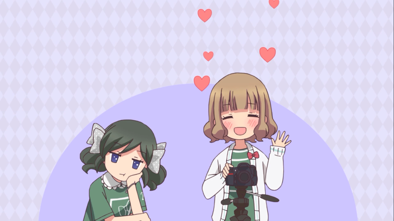 Description: Two anime girls standing next to each other with hearts flying above them and a camera in the foreground.