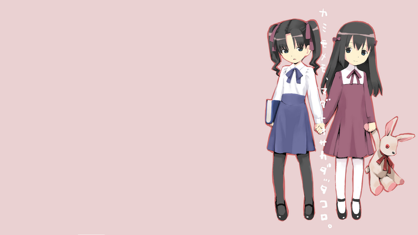 Description: Two anime girls holding hands and a rabbit in the background with music notes on it's ears and a pink background.