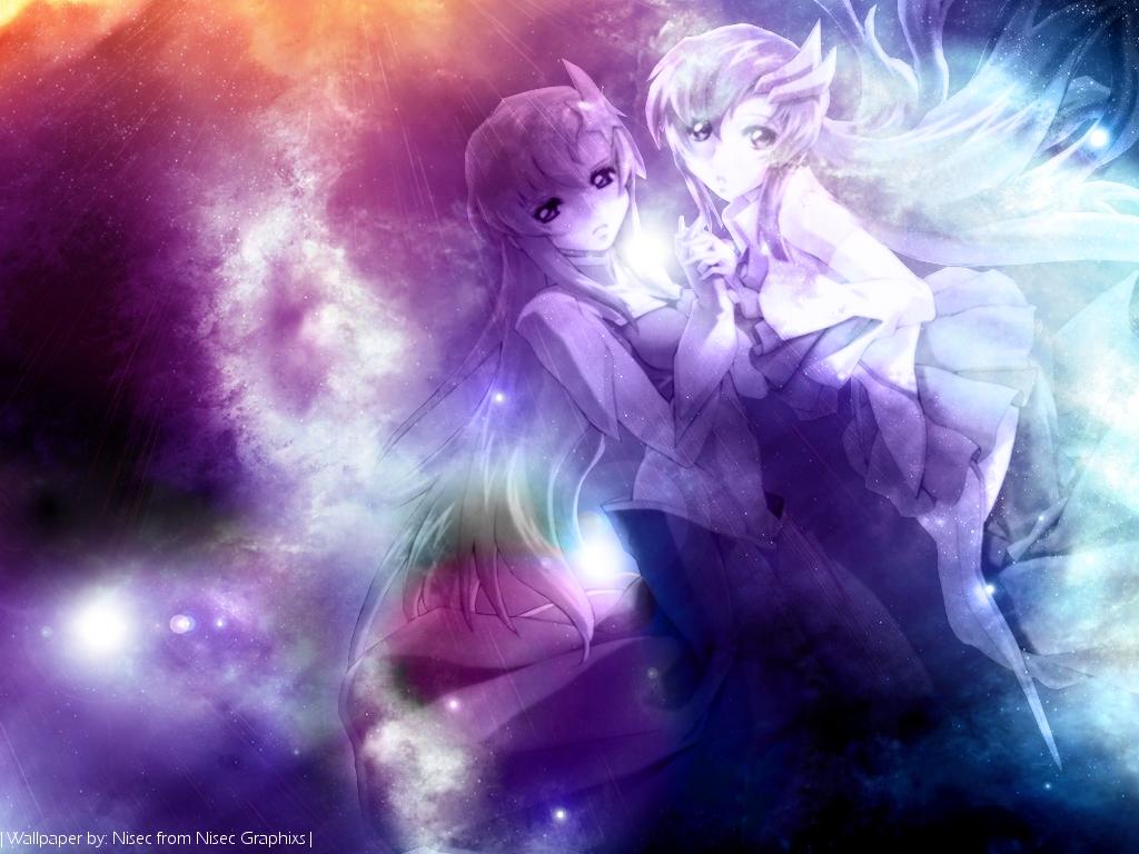 Description: Two anime characters are hugging in front of a colorful background with stars and a lightening effect in the background.