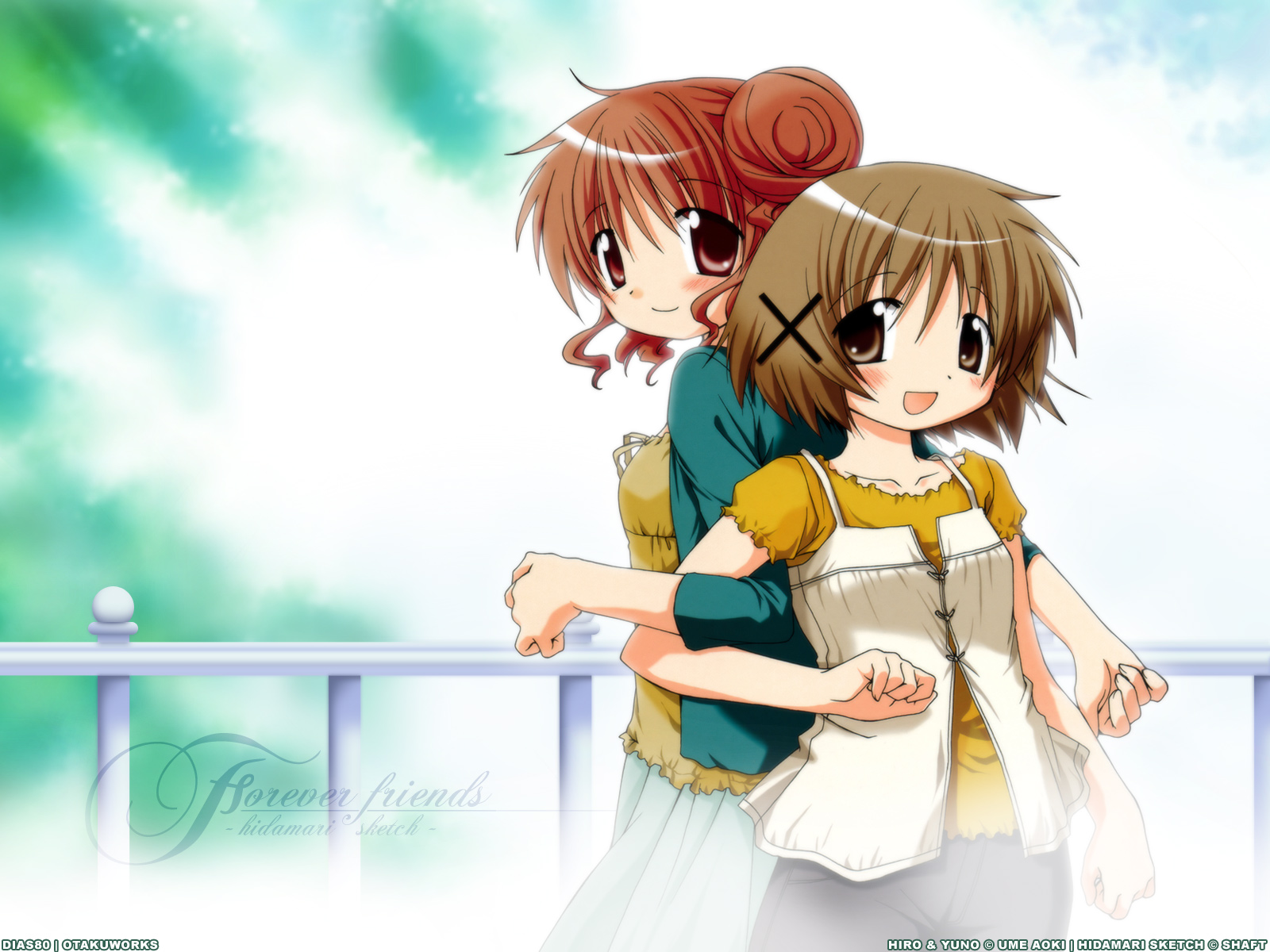 Description: Two anime girls hugging each other on a balcony with a sky background behind them and a fence in the foreground.