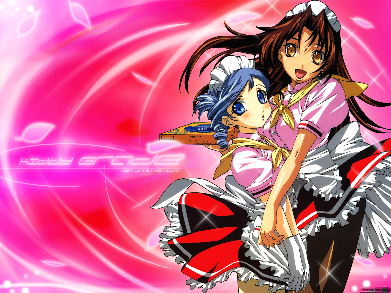 Description: Two anime characters hugging each other in front of a pink background with swirls and stars in the background.