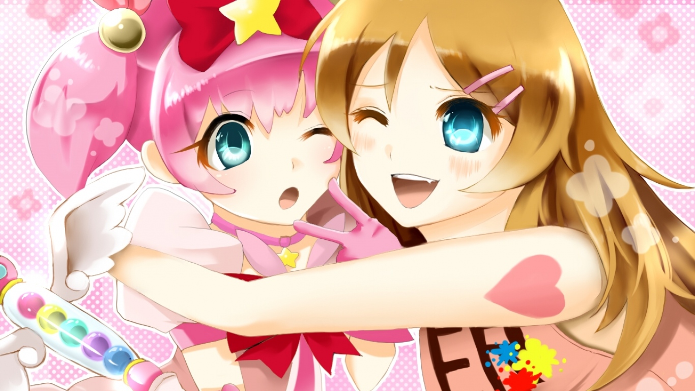 Description: Two anime girls hugging each other with a pink background and a pink background with hearts and stars on it.