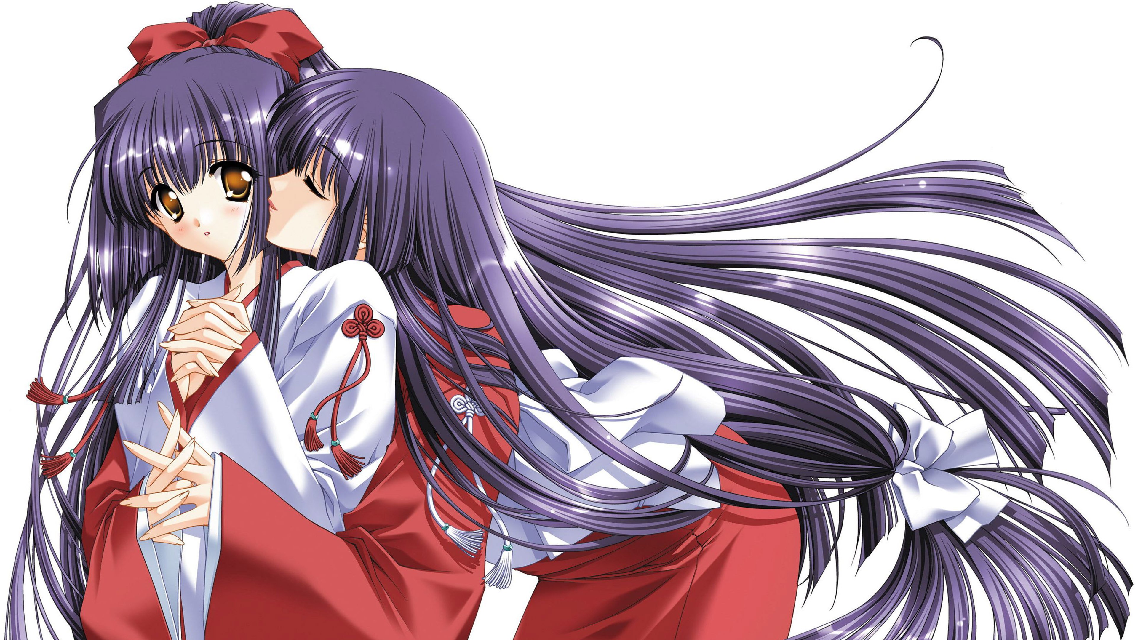 Description: Two anime girls with long hair and red outfits hugging each other with long hair and a bow on their head.
