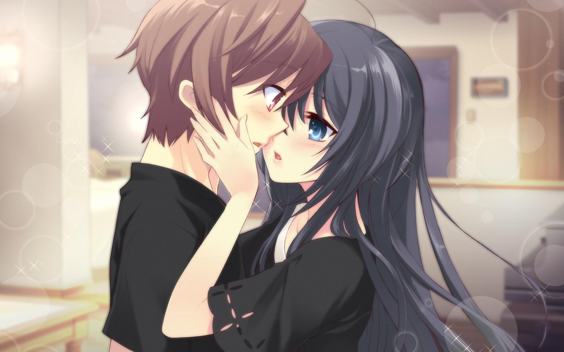 Description: A couple of anime girls hugging each other in a room with a table and chairs in the background and a wall with lights.