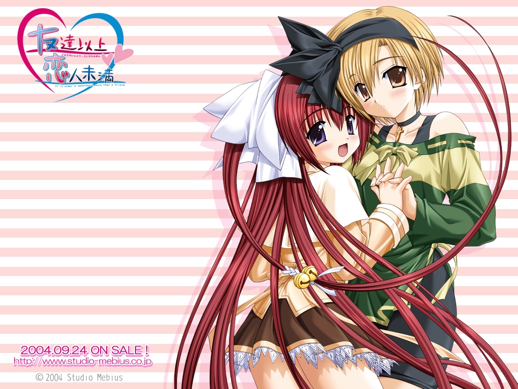 Description: A couple of anime girls hugging each other with long hair and a sailor hat on their head.