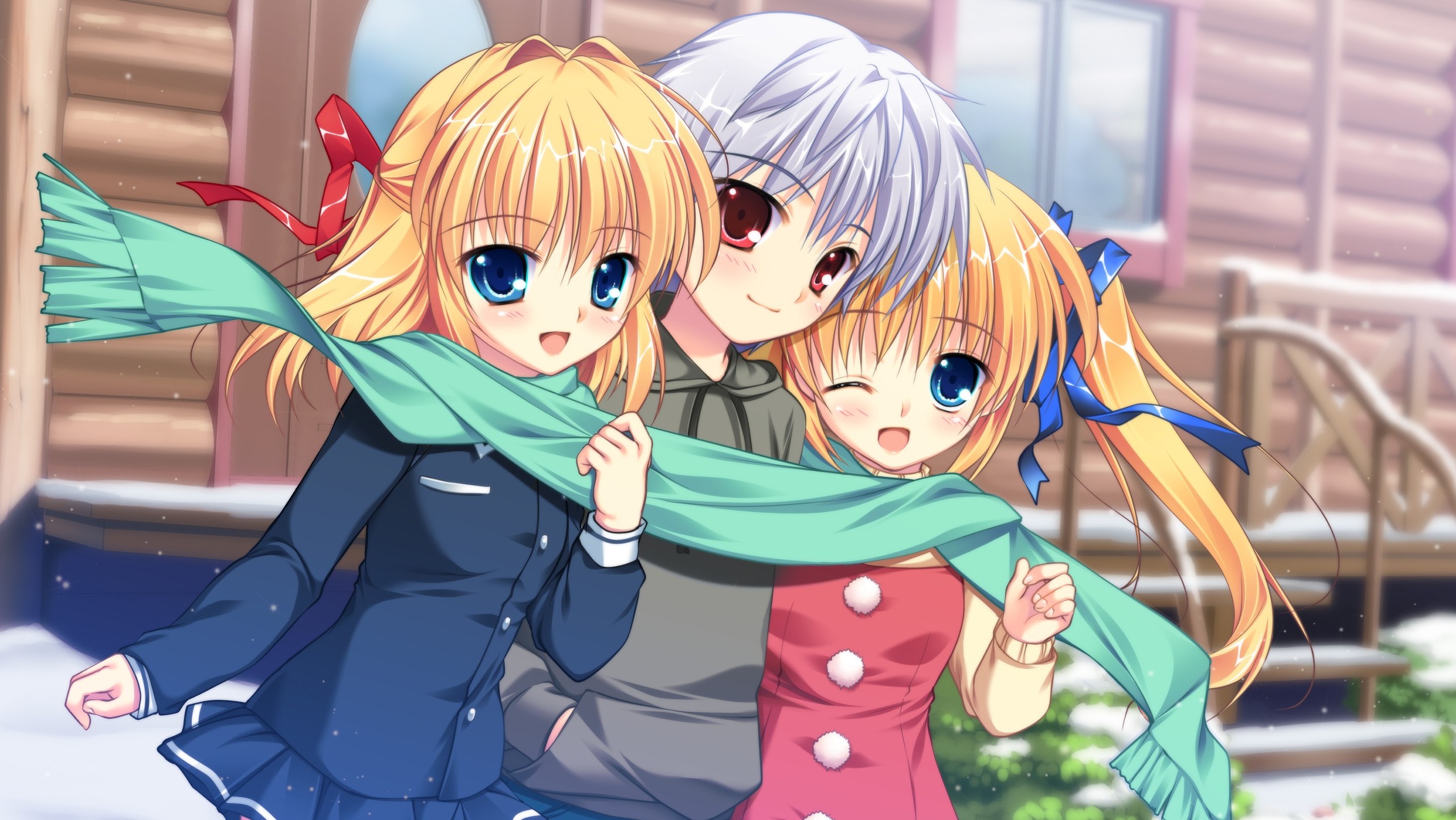 Description: Two anime girls are hugging in the snow outside a house with a scarf around their necks and a scarf around their neck.