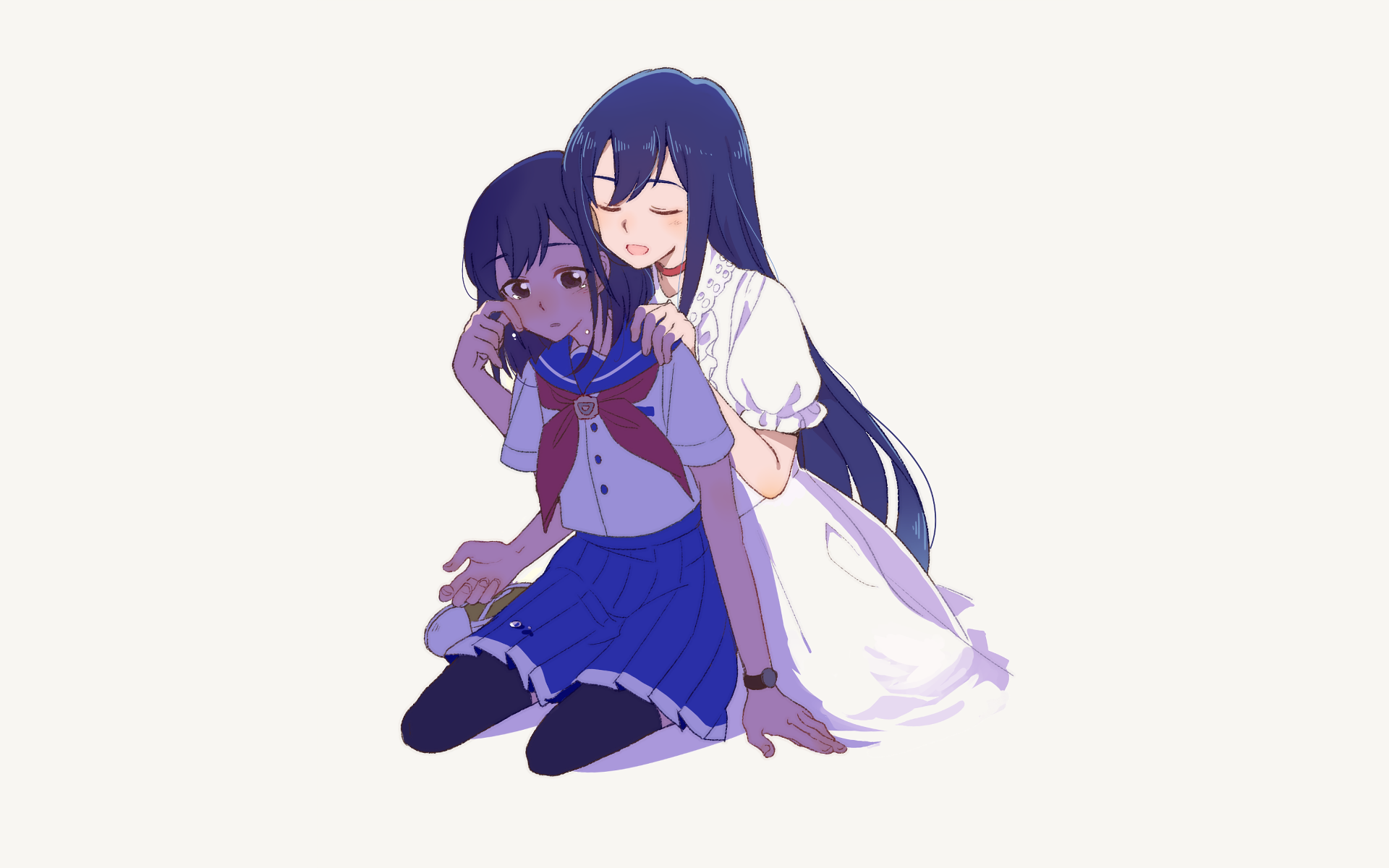 Description: Two anime girls hugging each other with a white background behind them and a white background behind them.