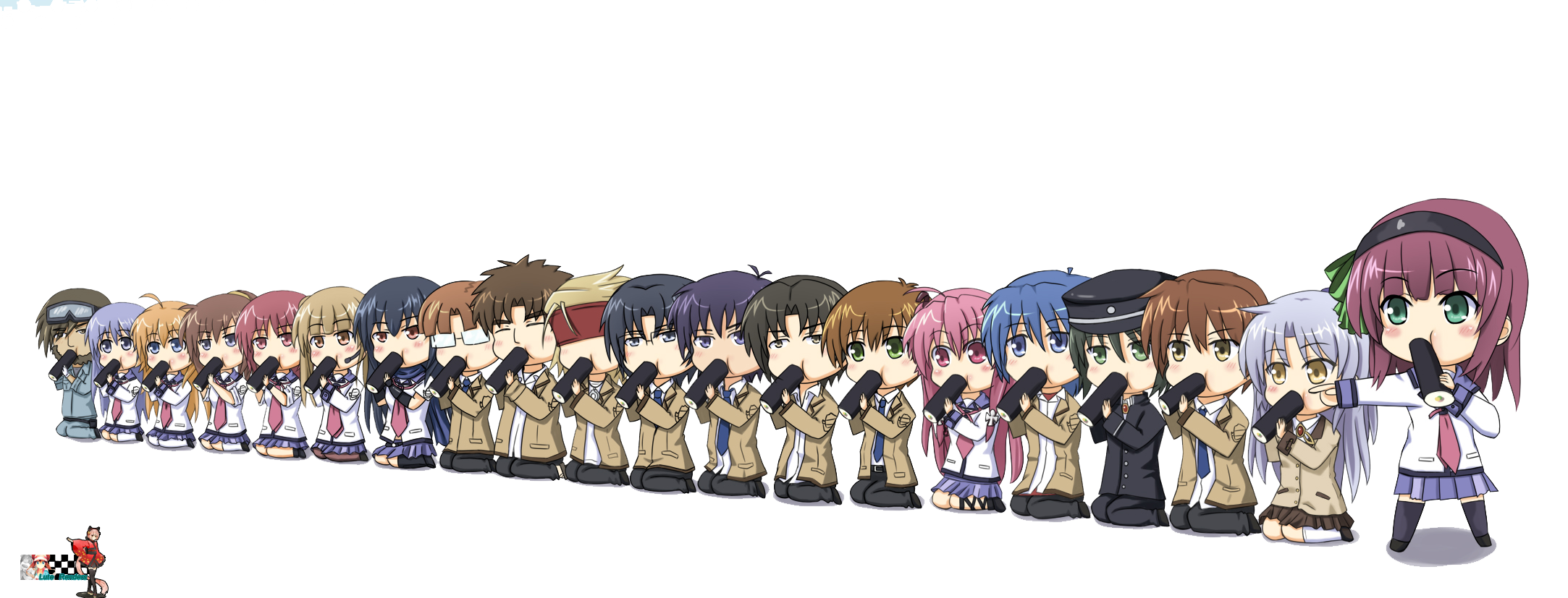 Description: A group of anime girls standing in a line with their heads turned to the side and their backs turned to the side.