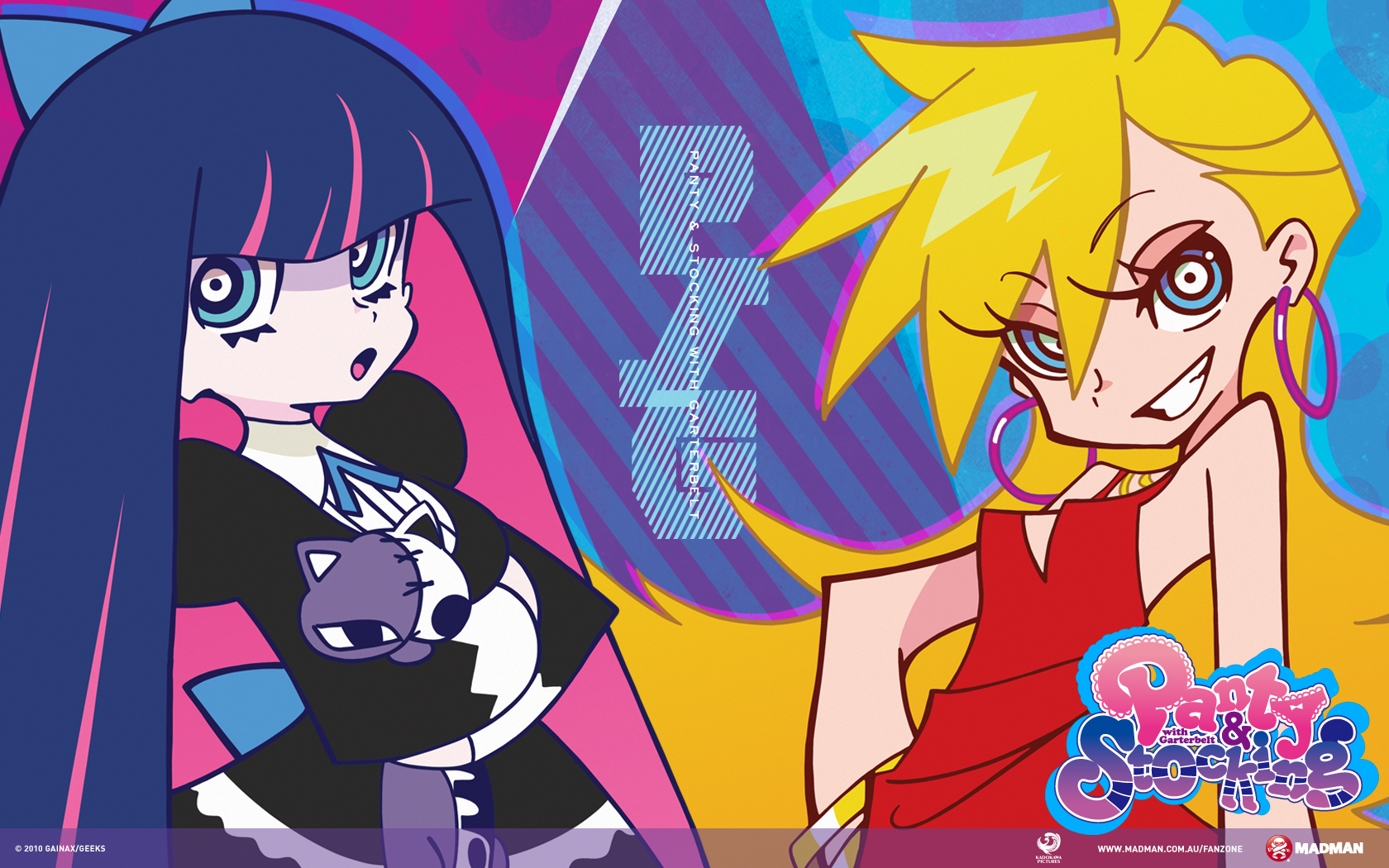 Description: Two anime girls with long hair and big eyes standing next to each other in front of a colorful background.