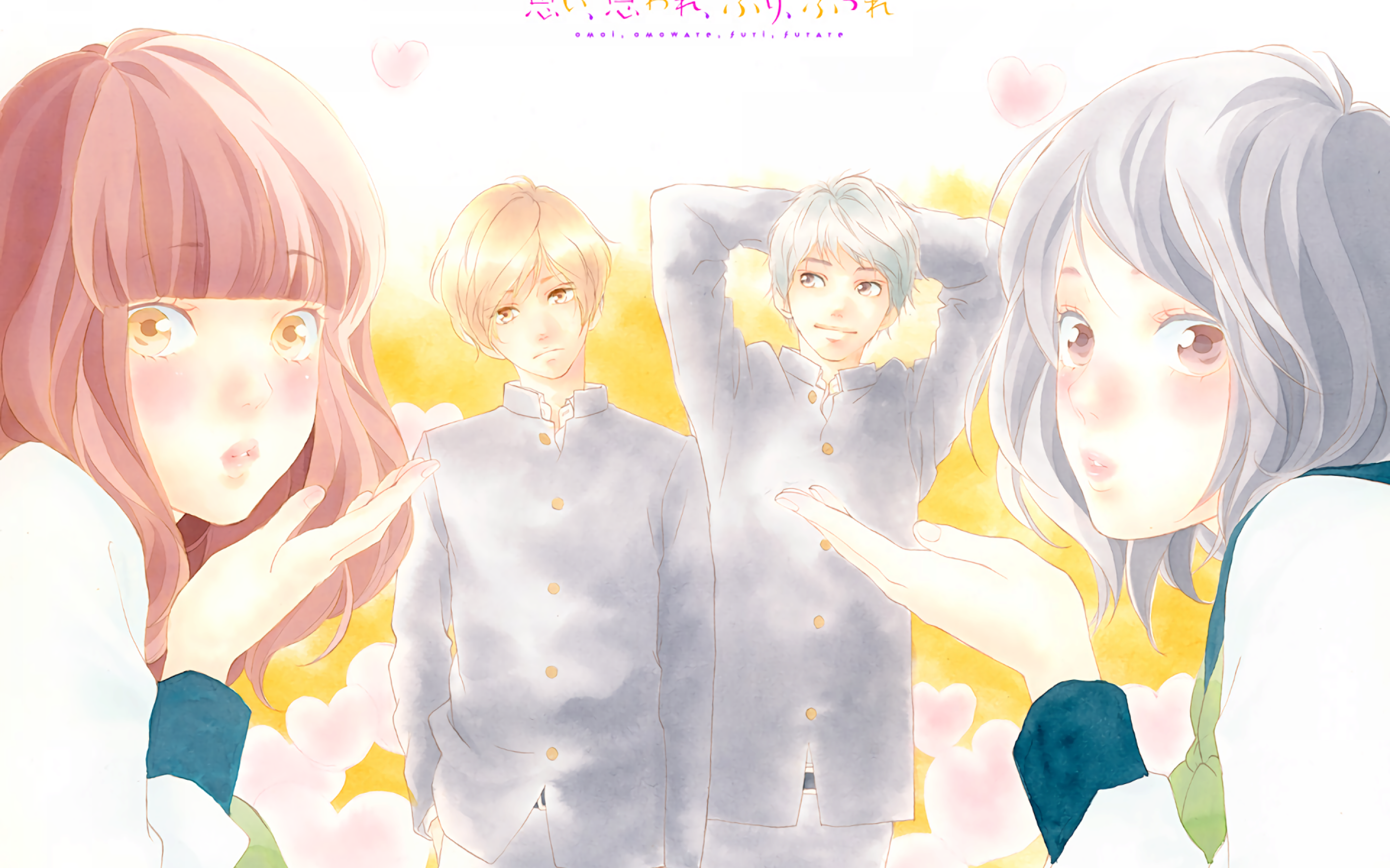 Description: Three anime girls with long hair and blue eyes are standing together and one is pointing at the other side of the image.