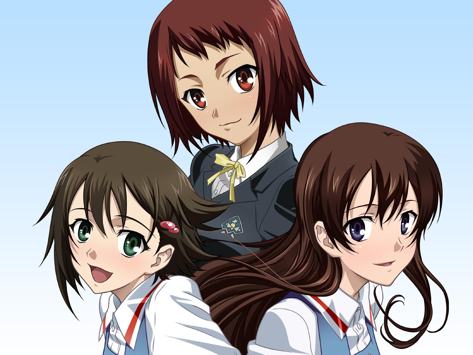 Description: Three anime girls with long hair and blue eyes are standing together and smiling at the camera.