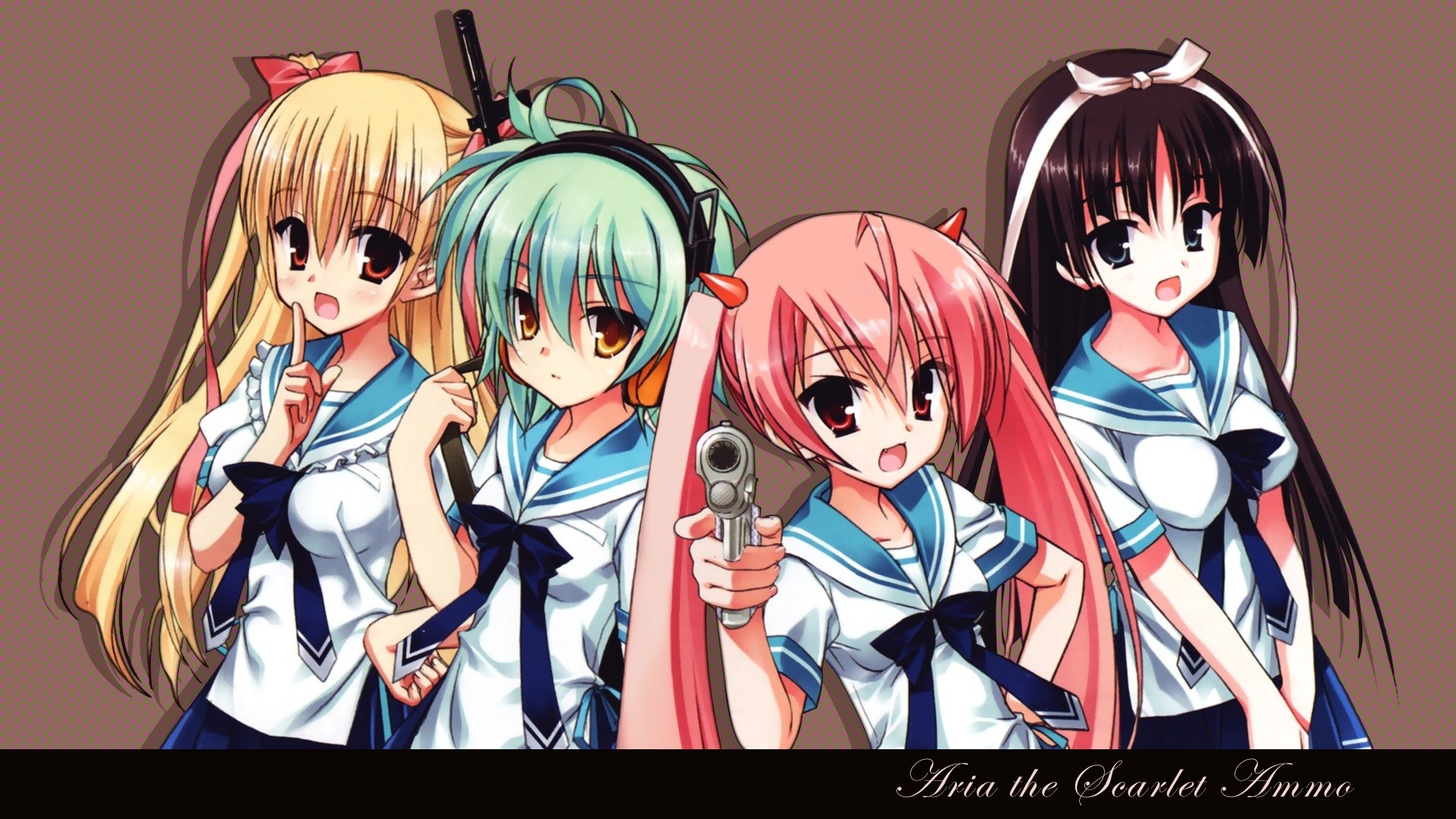 Description: Three anime girls with long hair and bows holding guns and pointing at something in the air with a caption that reads.