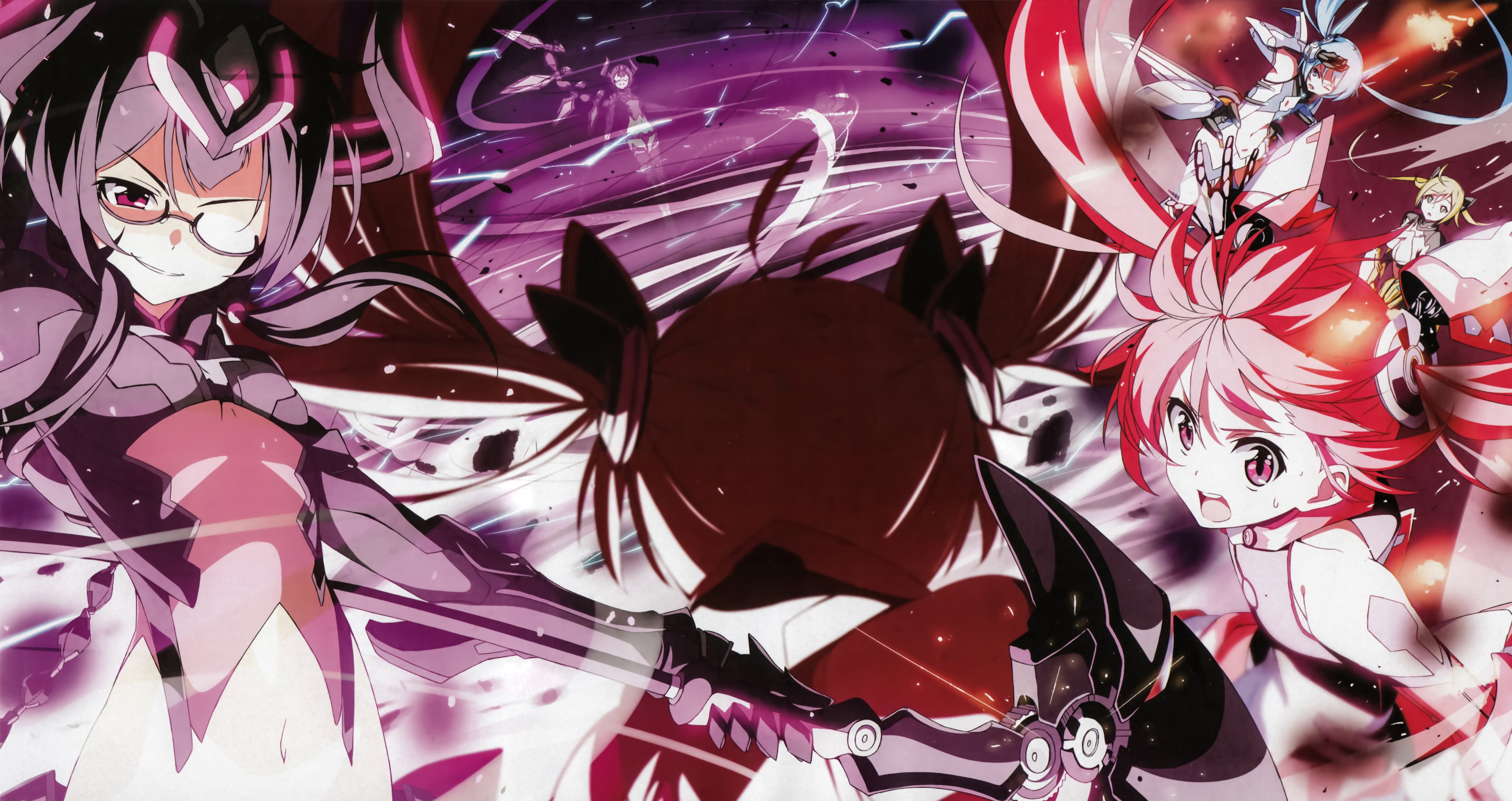 Description: A group of anime girls with long hair and a horse in the background with a purple background and a red horse.