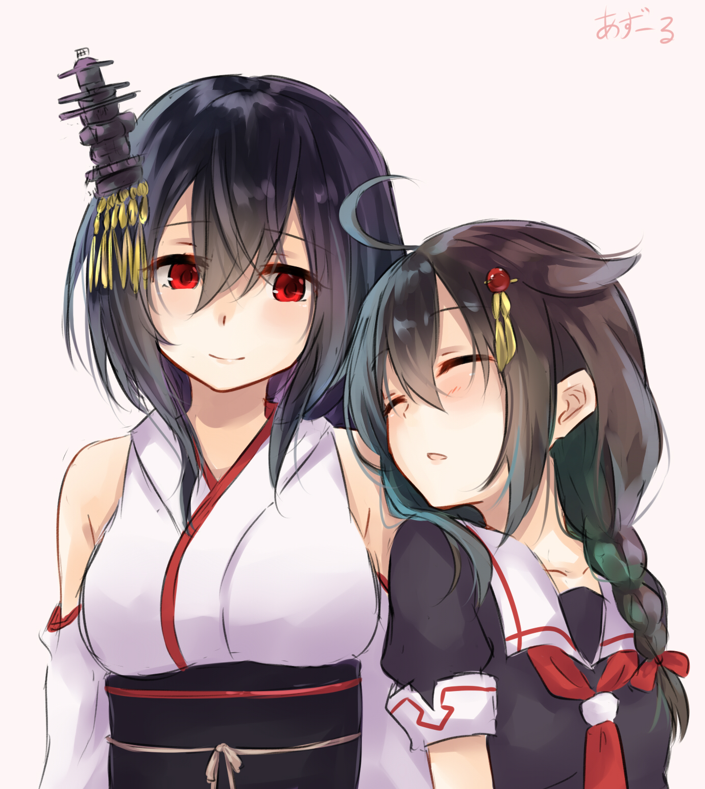 Description: Two anime girls with long hair and red eyes are standing next to each other.