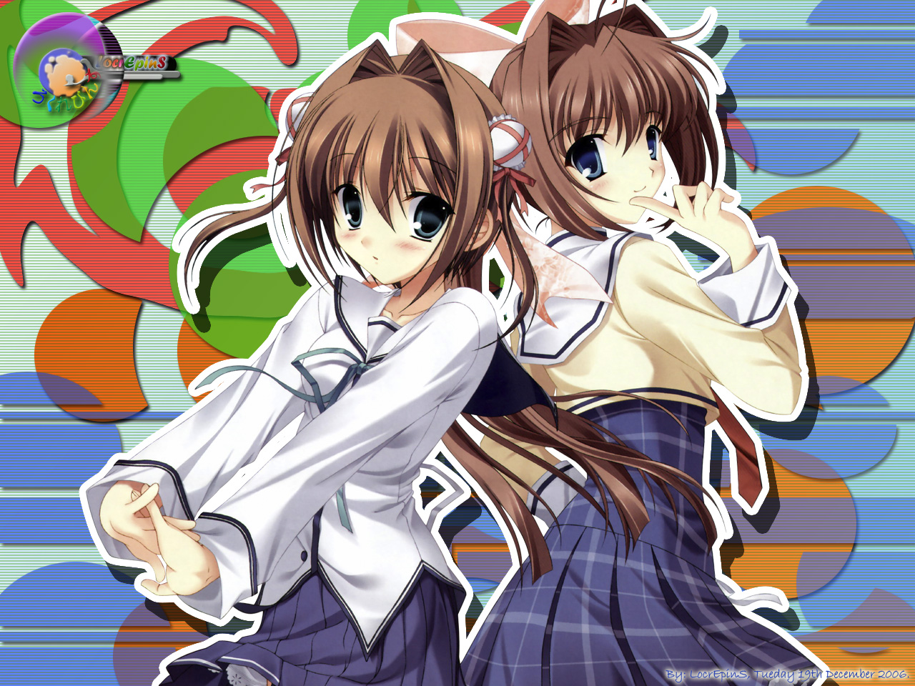 Description: Two anime girls with long hair and a white shirt and blue skirt are standing in front of a colorful background.