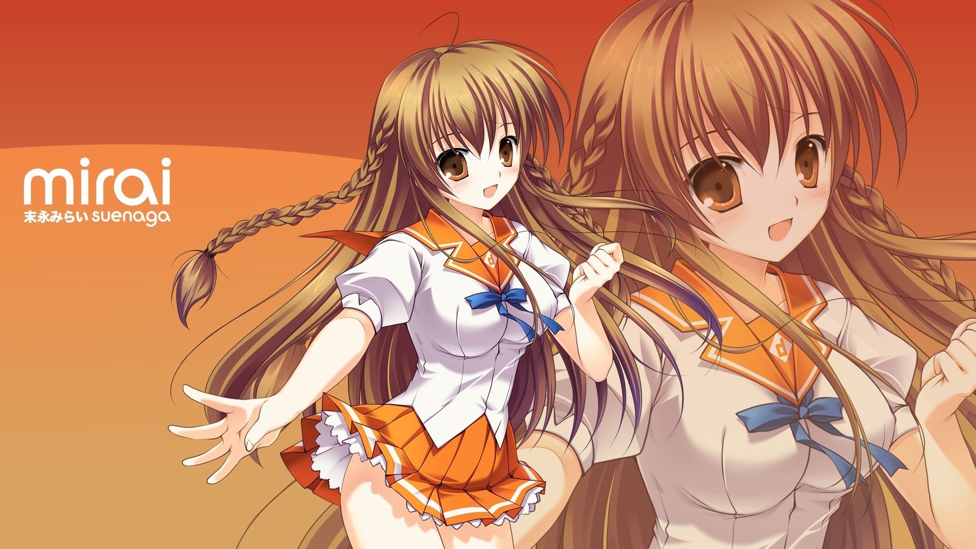 Description: Two anime girls with long hair and a white shirt and orange skirt.
