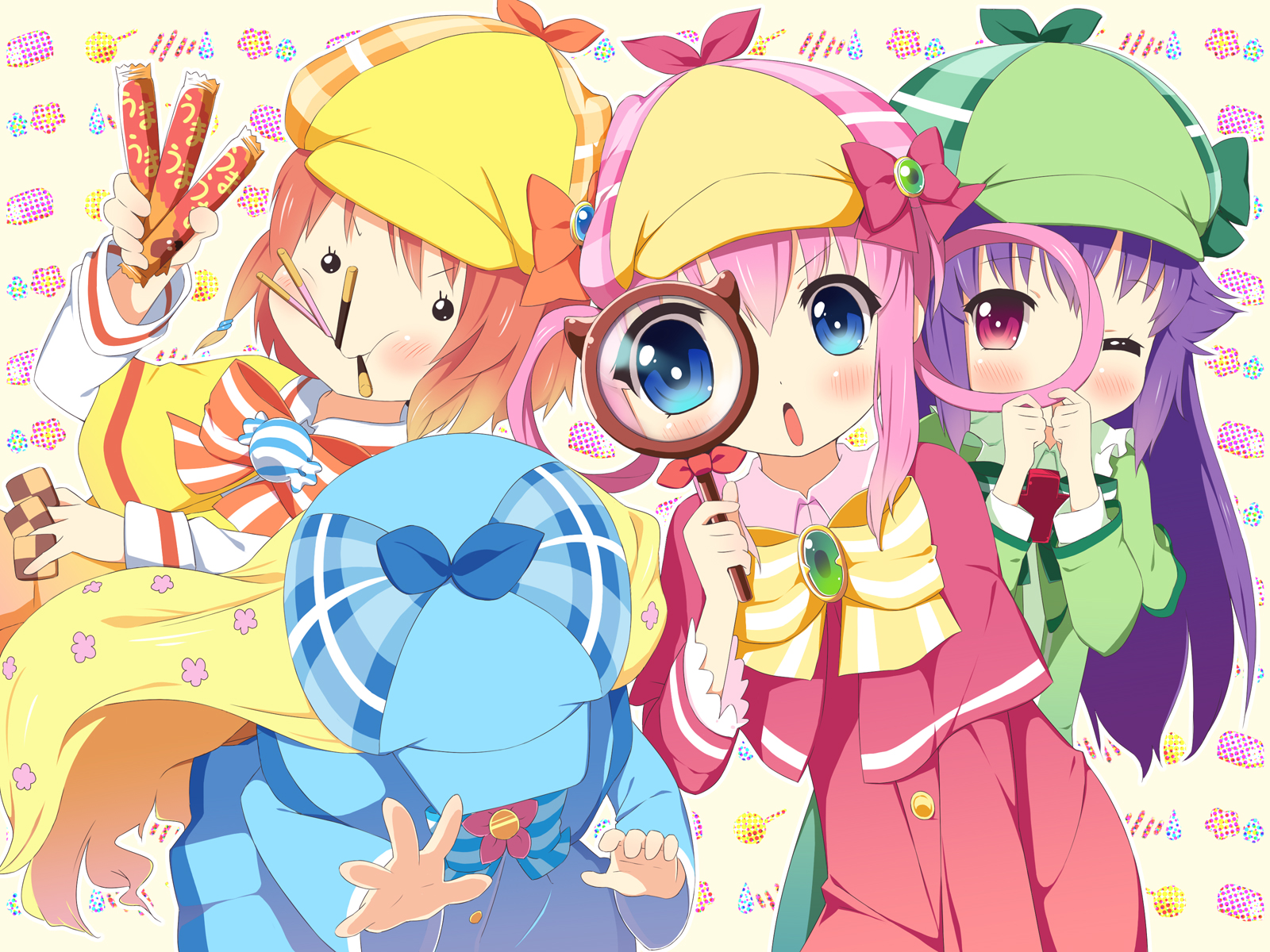Description: Three anime girls looking through a magnifying glass with a cat on the other side of the image.