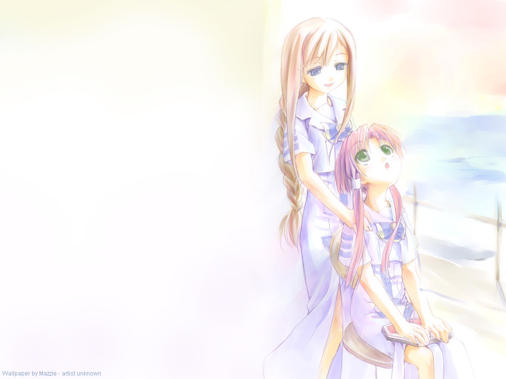 Description: A couple of anime girls sitting next to each other on a bench near the ocean and a pier with a rainbow in the background.