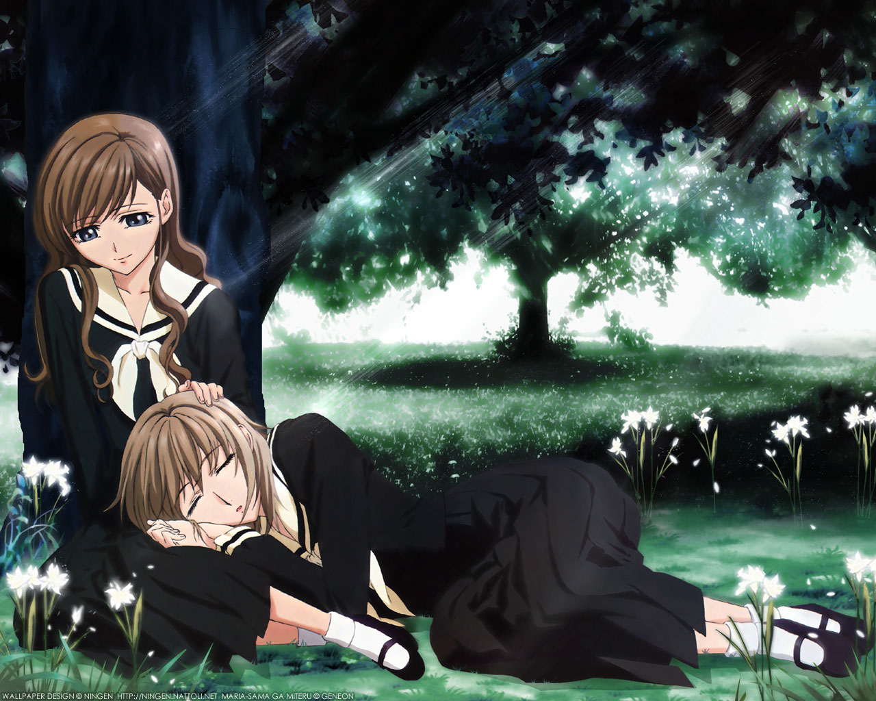Description: Two anime girls laying on the ground in a park with trees and grass in the background.