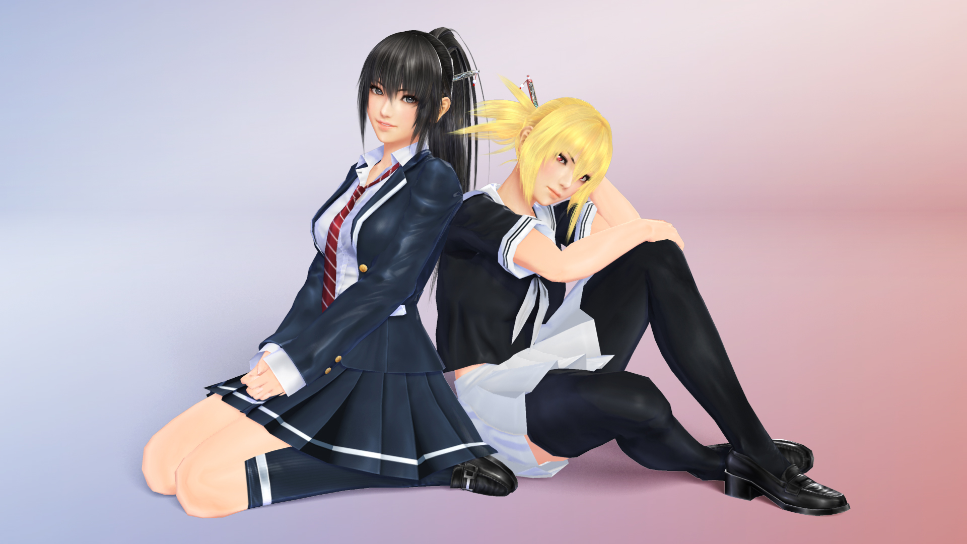 Description: Two anime girls sitting next to each other on a pink and blue background with a pink background behind them.