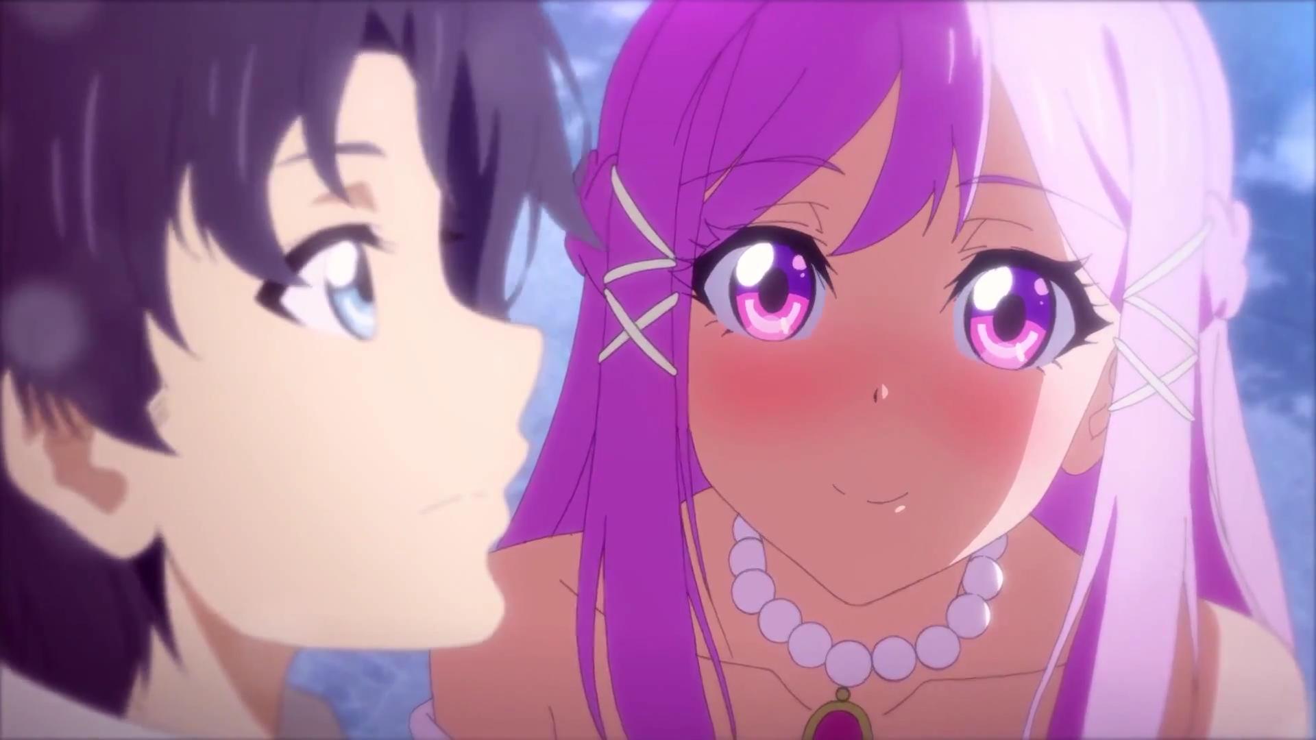 Description: A couple of anime girls with pink hair and blue eyes kissing each other with a smile on their face.