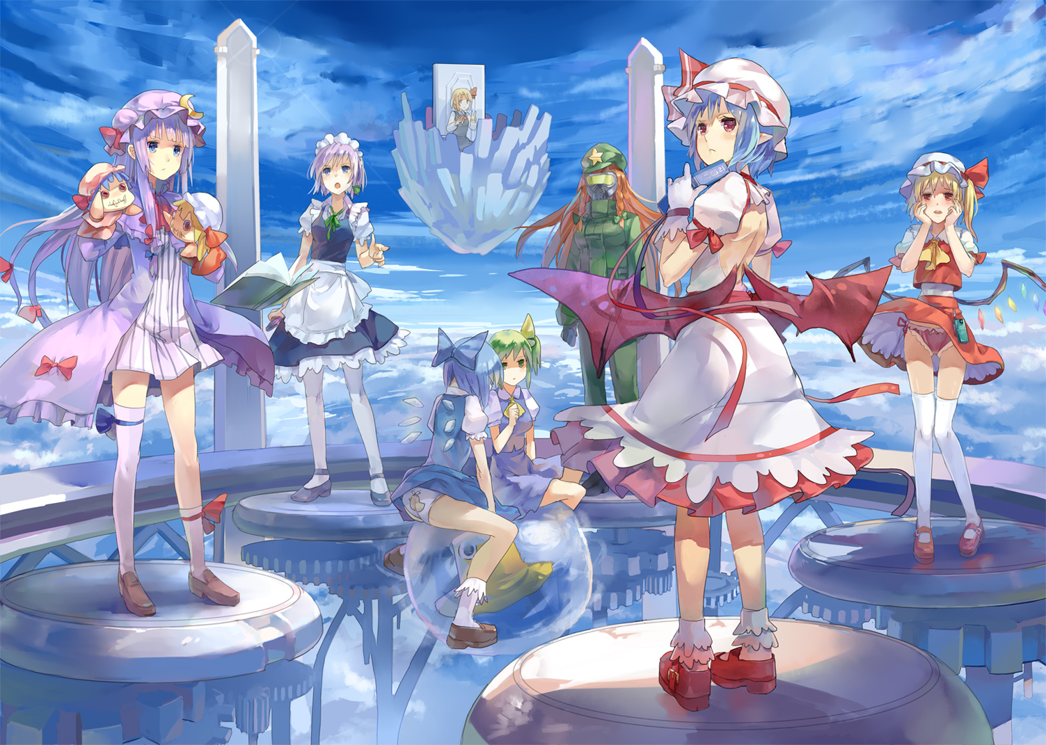 Description: A group of anime girls standing on top of a platform in the sky with clouds behind them and a bird flying overhead.