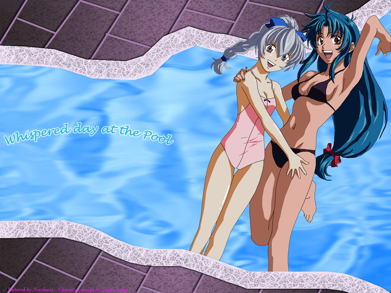 Description: Two anime girls in a pool with a message written on the side of the picture and a picture of the same girl.