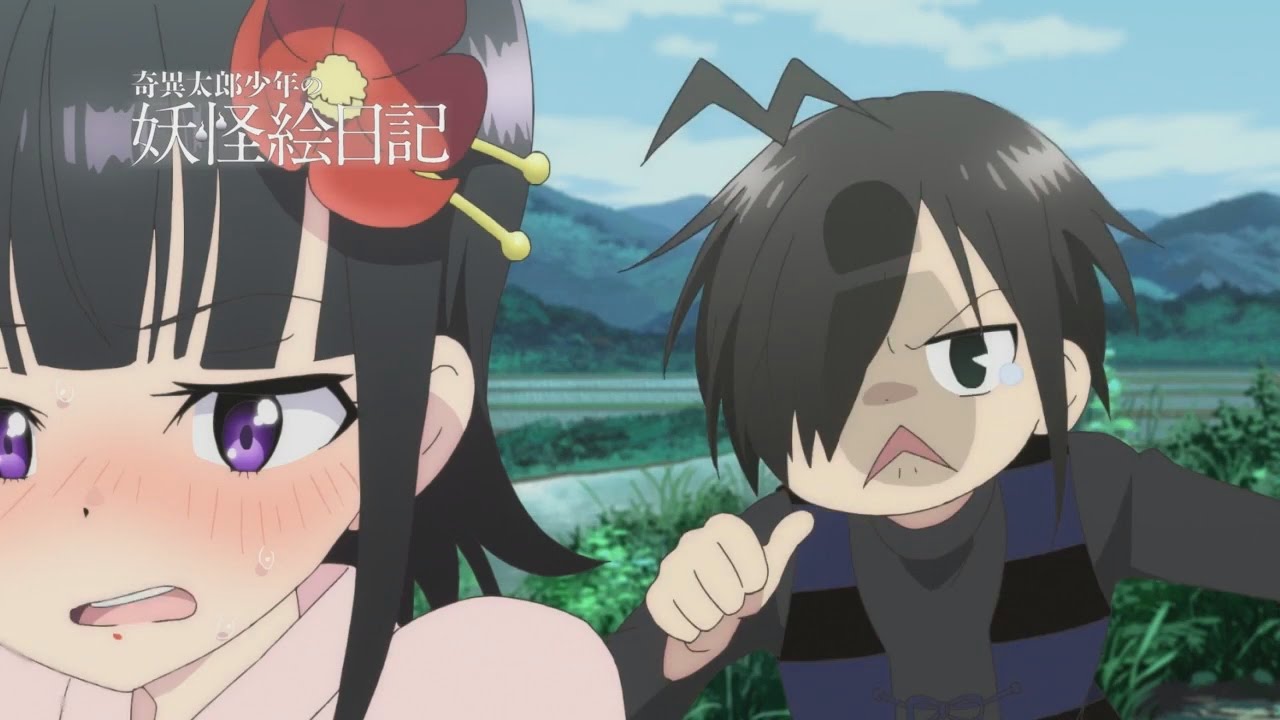 Description: Two anime girls with purple eyes and black hair are facing each other and one is holding a flower in her hair.