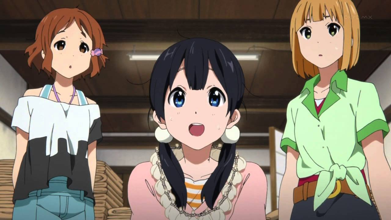 Description: Three anime girls standing next to each other in a room with a ceiling fan in the background and a ceiling fan in the foreground.