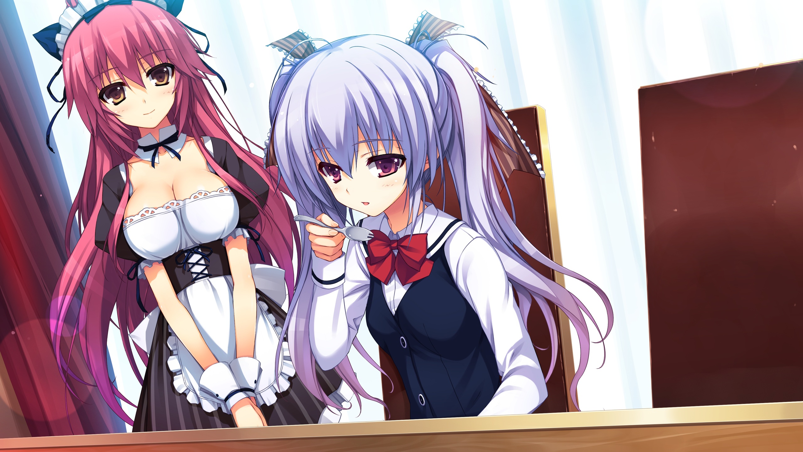Description: Two anime girls standing next to each other in a room with a mirror and a door in the background.