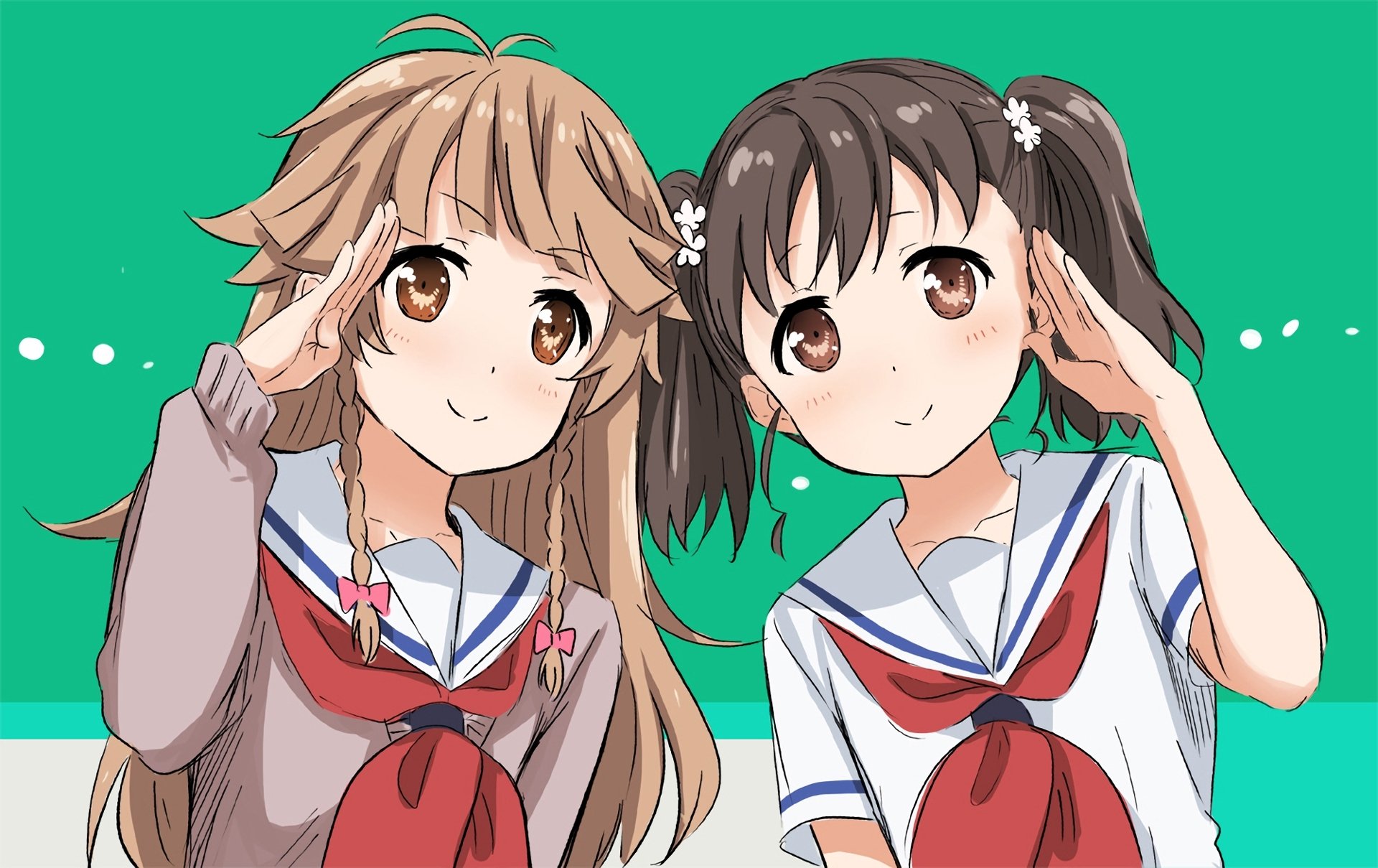 Description: Two anime girls with long hair and brown eyes are standing next to each other and one is wearing a sailor's uniform.