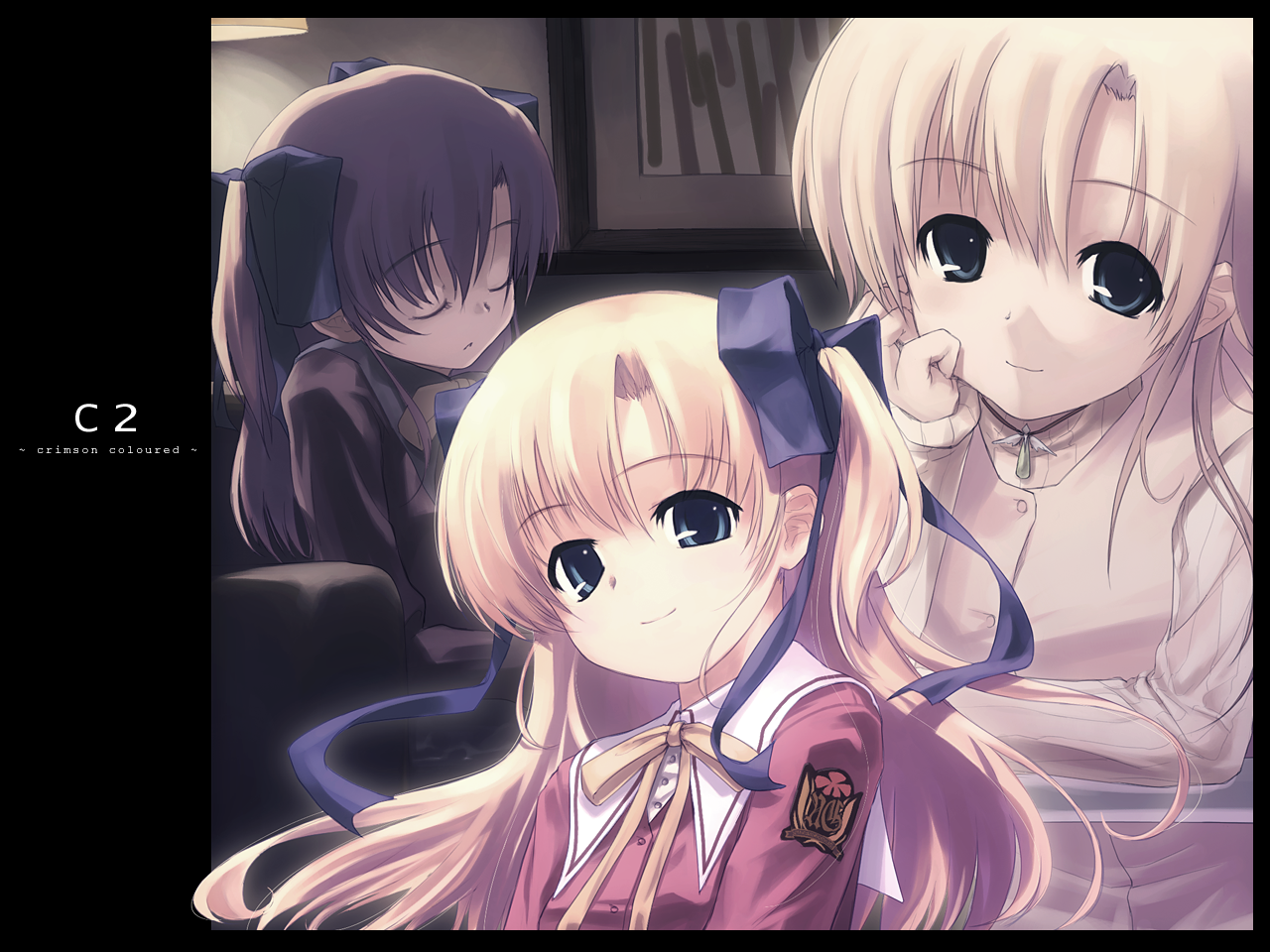 Description: A group of anime girls sitting next to each other in a room with a black background and a caption that reads c 2.