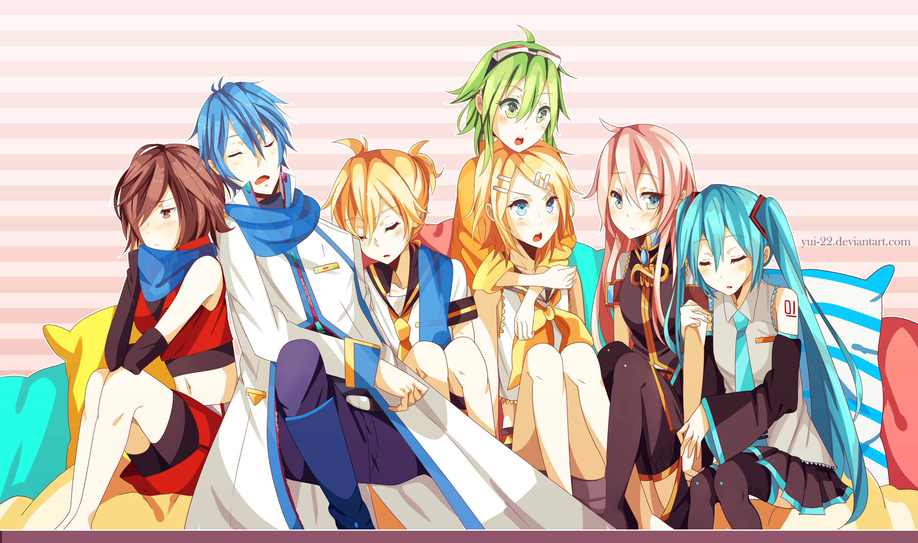 Description: A group of anime girls sitting next to each other on a bed together with a pink background and a pink stripe.