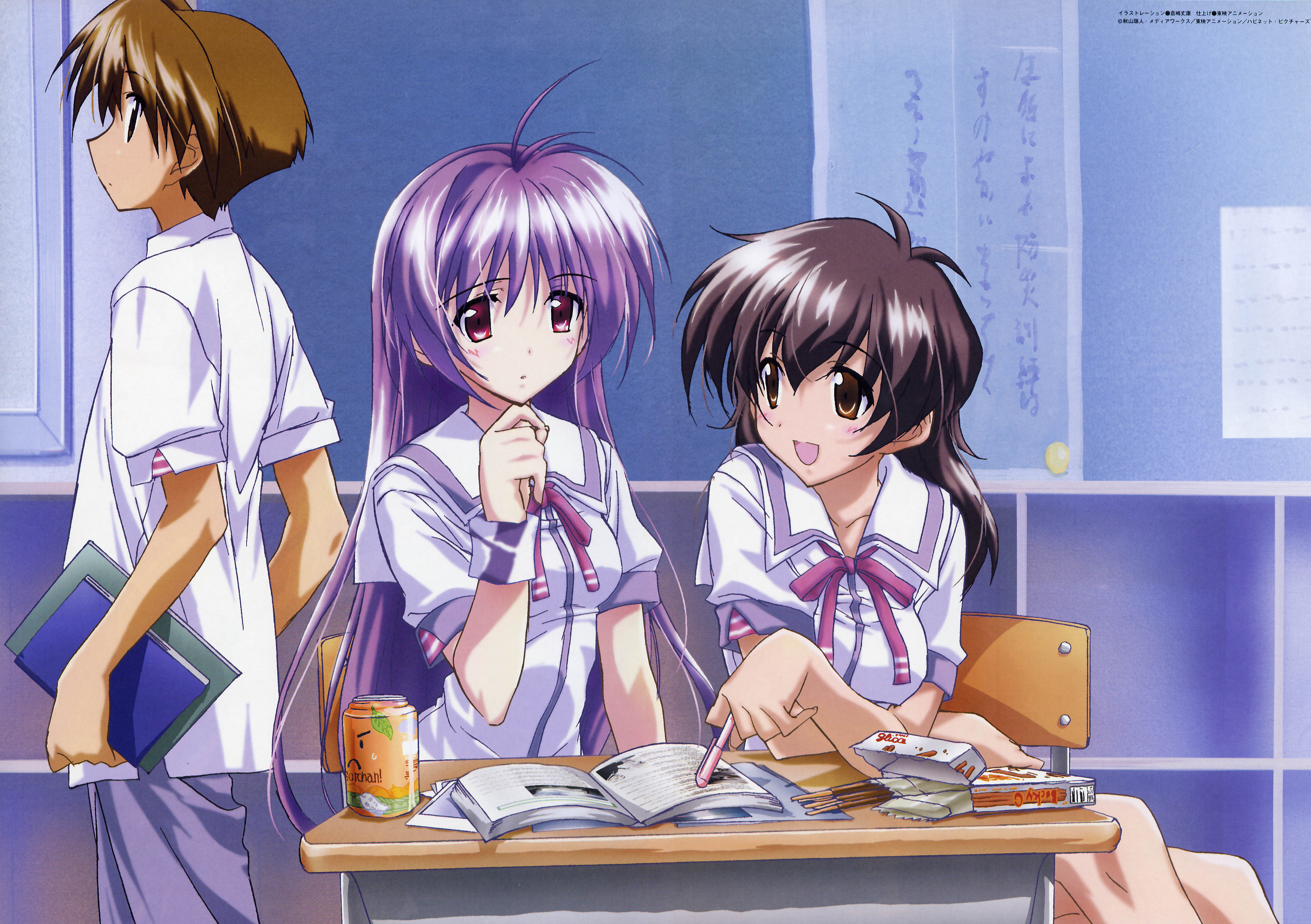 Description: Three anime girls sitting at a desk with books and a drink in front of them.