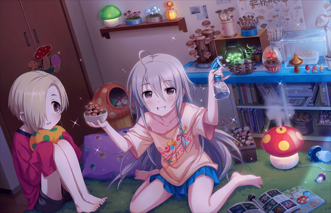 Description: Two anime girls sitting on the floor with a book and a mushroom in front of them.