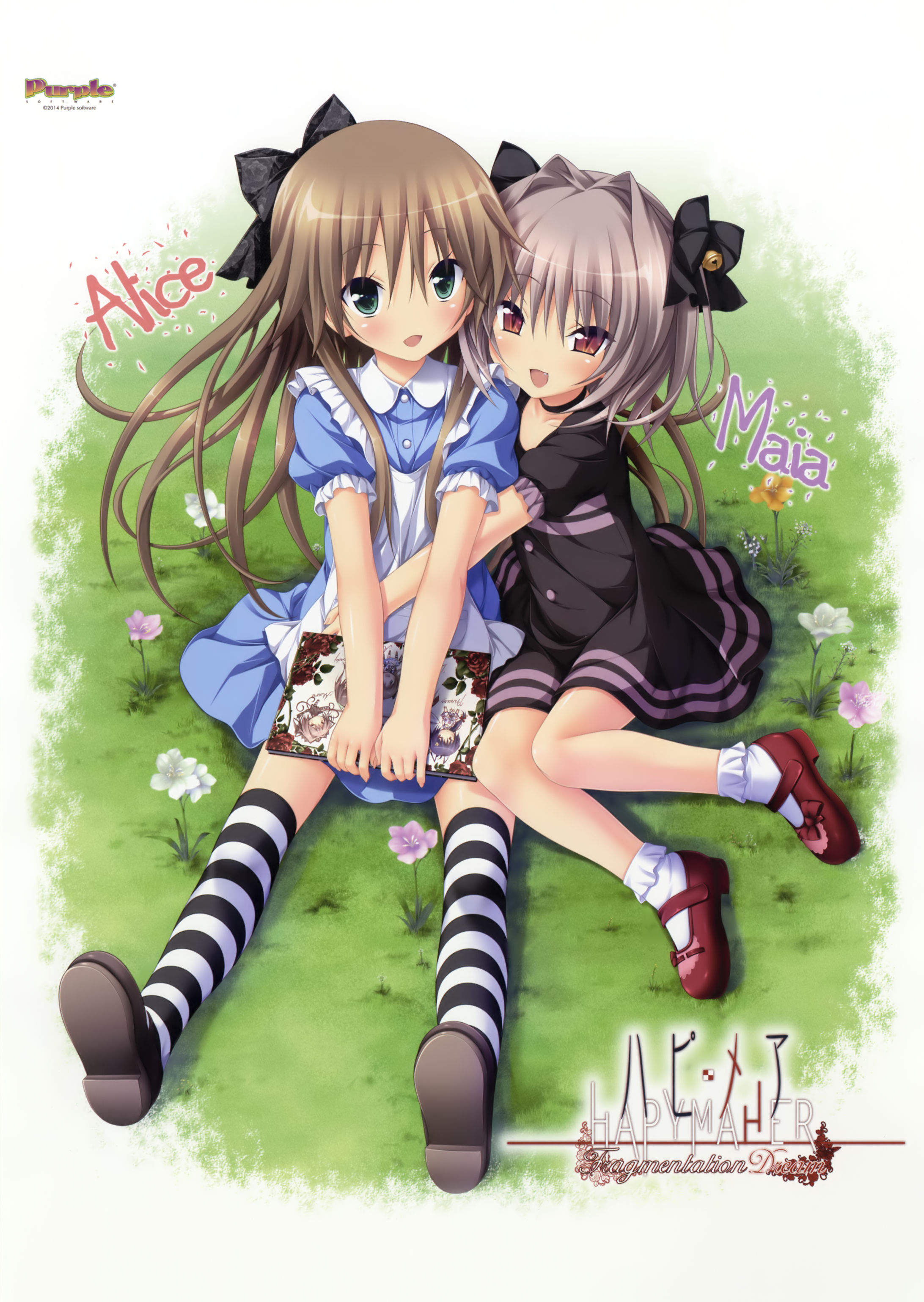 Description: Two anime girls sitting on the grass together with their arms around each other.