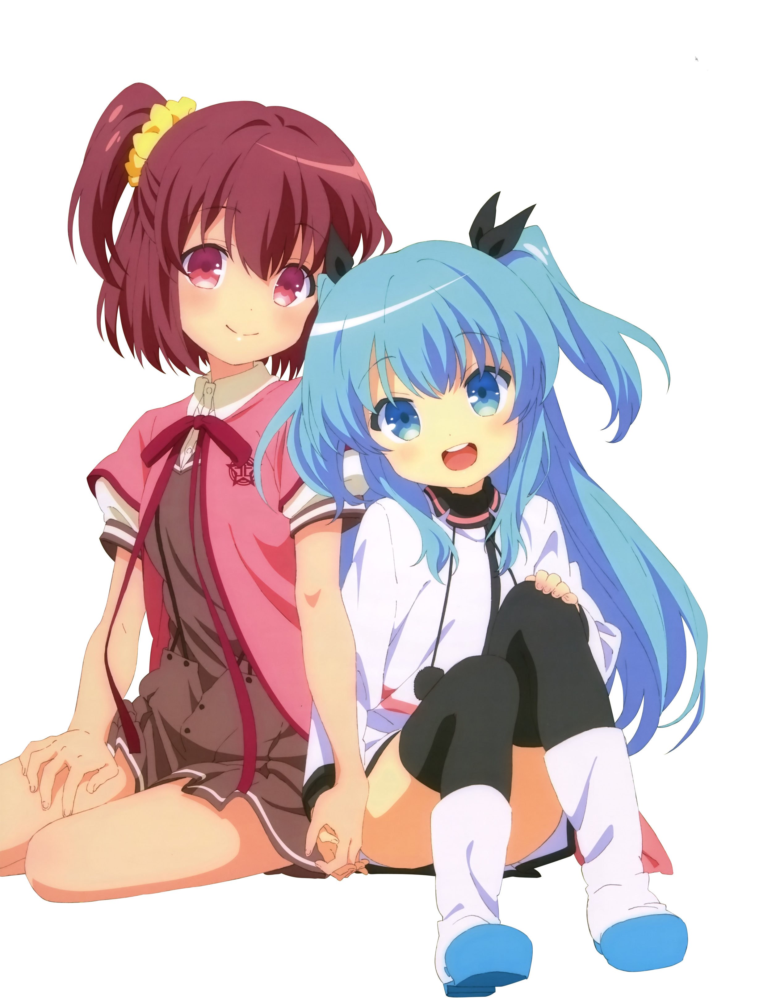 Description: Two anime girls sitting next to each other on the ground with their backs to each other.