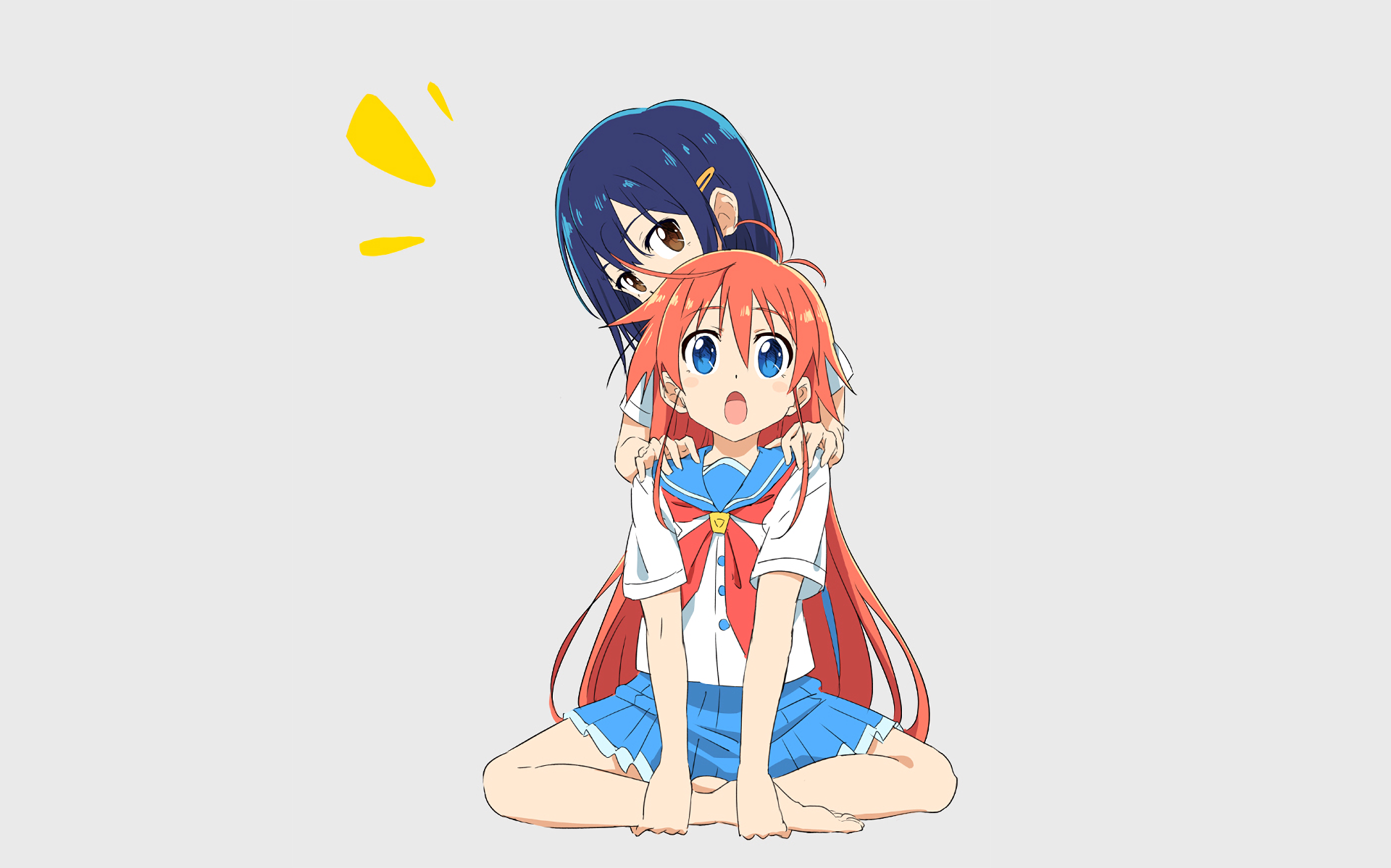 Description: A couple of anime girls sitting on the ground with their arms around each other and one of them is holding the other.