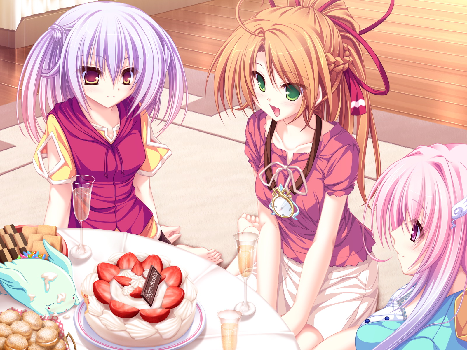 Description: Three anime girls sitting at a table with a cake and fruit on it.