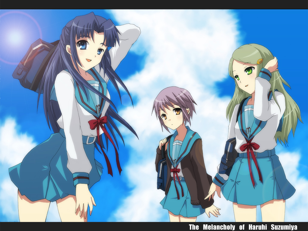 Description: Two anime girls standing next to each other on a cloudy day with the sky in the background and the sun shining behind them.