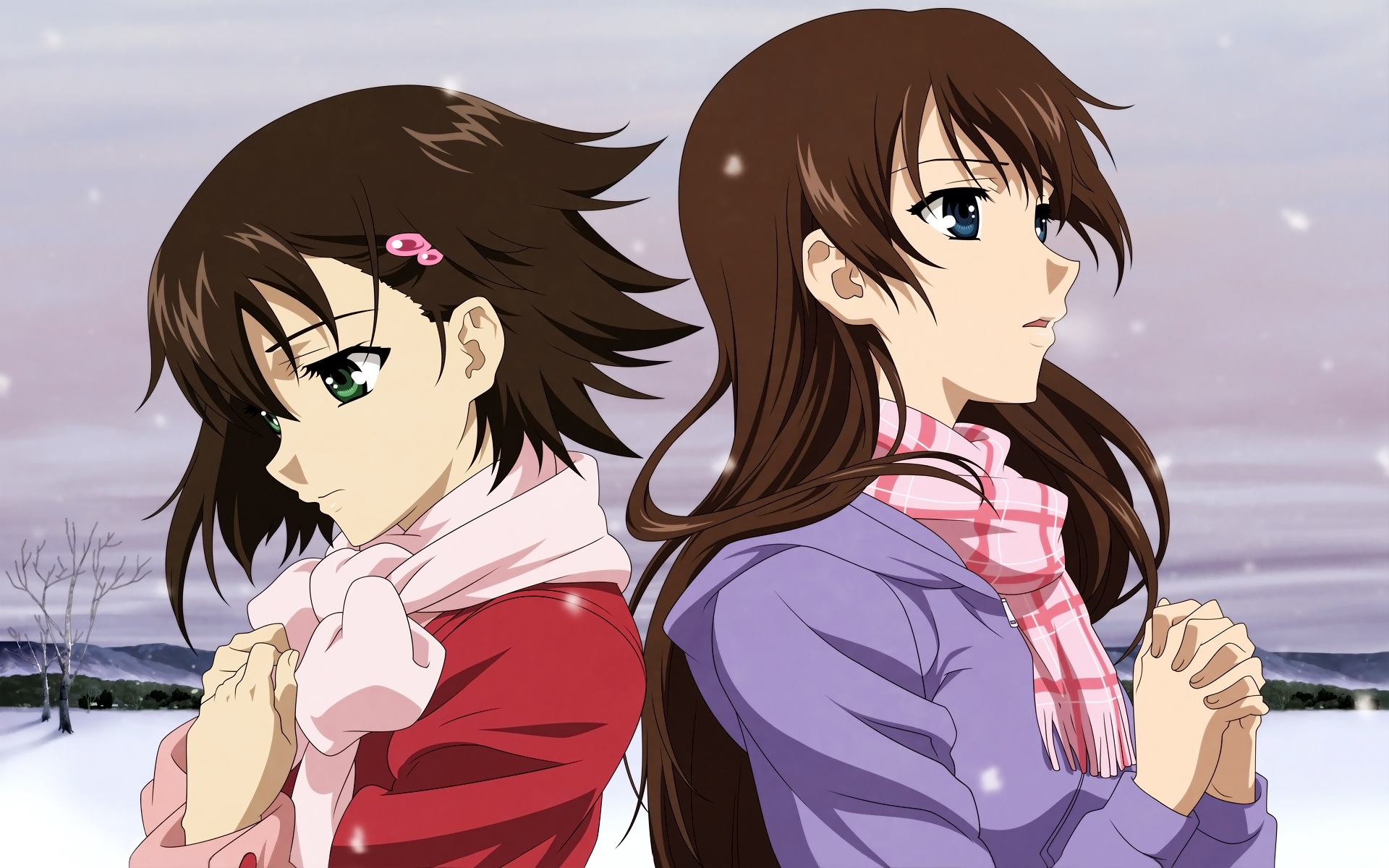 Description: Two anime girls standing in the snow with their arms around each other.