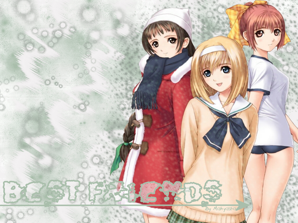 Description: A group of anime girls standing next to each other in front of a green background with snowflakes.
