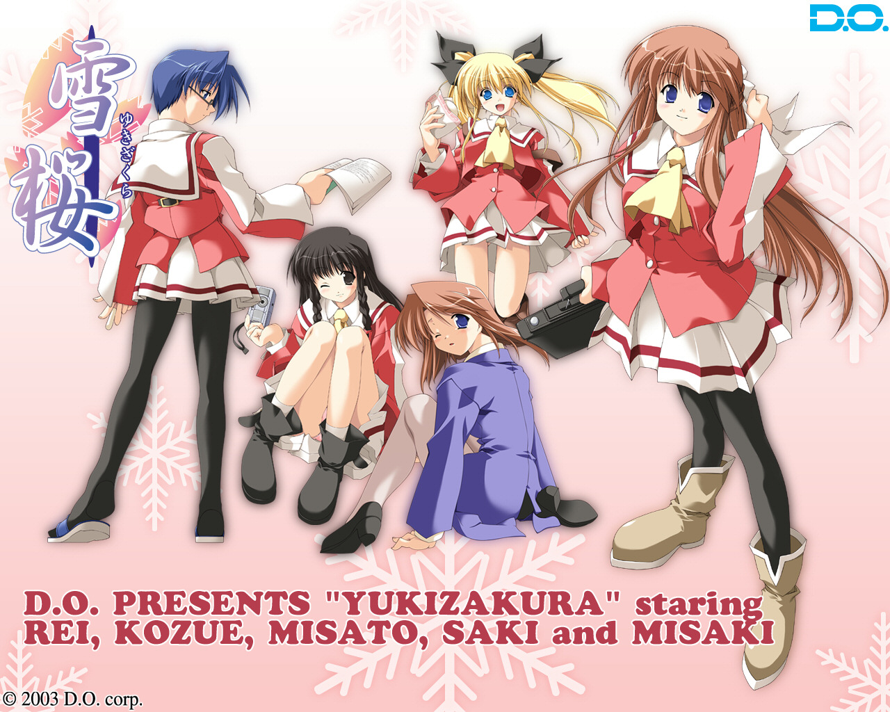 Description: A group of anime girls standing next to each other in front of snowflakes and snowflakes.