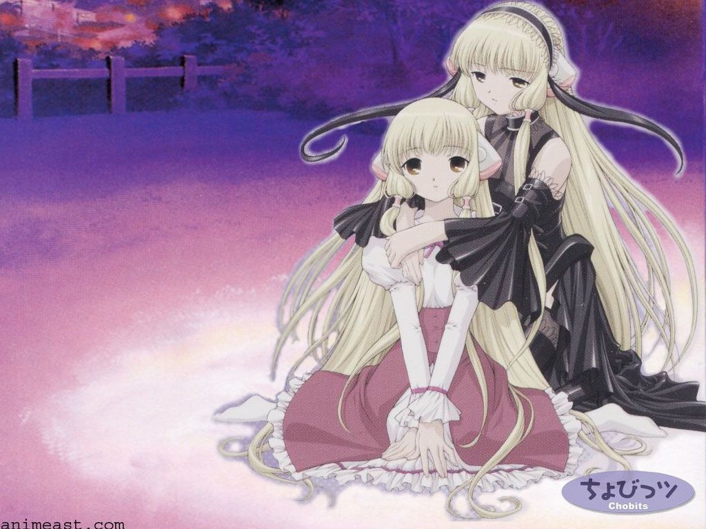Description: Two anime girls sitting on a snowy surface with trees in the background and a purple sky in the background.