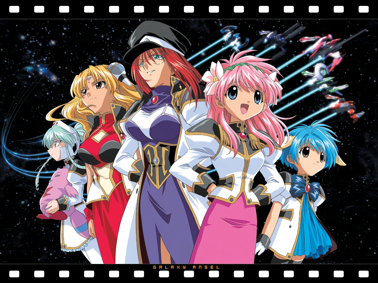 Description: A group of anime girls standing next to each other in front of a space background with stars and a black background.