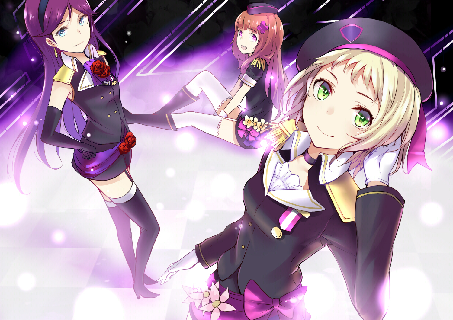 Description: A group of anime girls standing next to each other on a stage with lights behind them and a purple background.